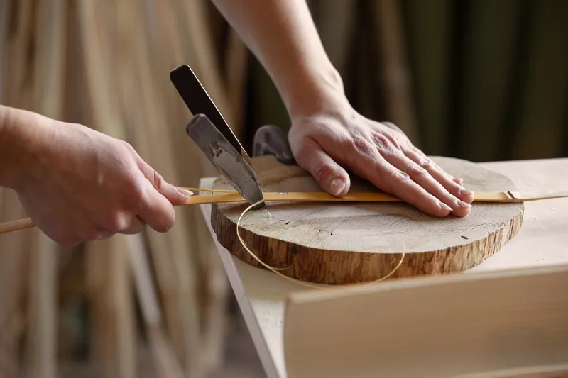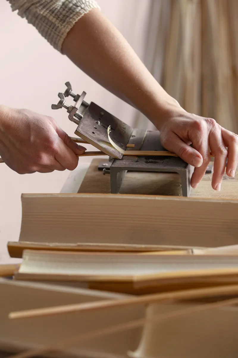 Le processus commence par la transformation de la canne brute en lamelles de quelques millimètres, travaillées à l'aide de lames et couteaux traditionnels.